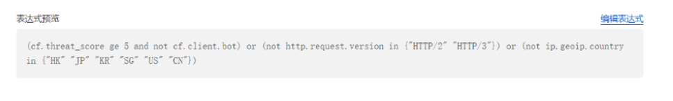 1 | (cf.threat_score ge 5 and not cf.client.bot) or (not http.request.version in {"HTTP/2" "HTTP/3"}) or (not ip.geoip.country in {"AU" "CA" "FR" "DE" "HK" "IR" "JP" "KR" "MY" "SG" "TW" "GB" "US" "CN"}) |