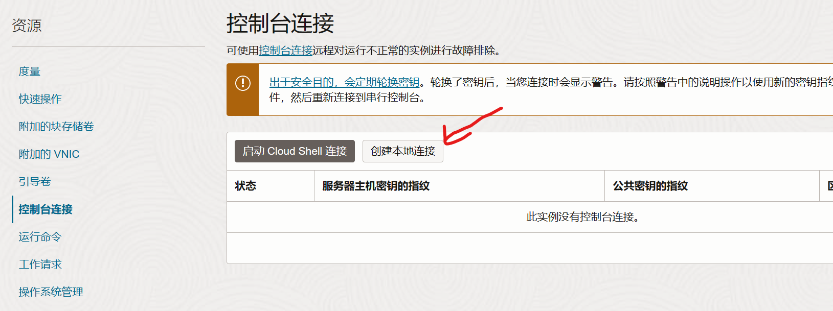 进入甲骨文的控制台,打开实例的面板,在左下角找到控制台连接,点击创建控制台连接